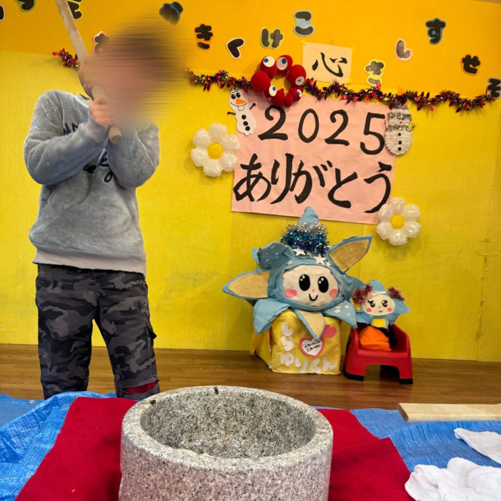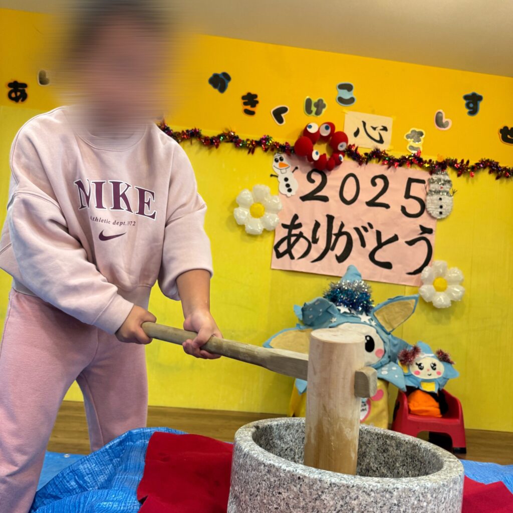 杵を持つ前は「できるかな…?」と少し緊張した表情の子もいましたが、いざ始まると友だちや職員の「よいしょ!」の声に背中を押され、最後までやりきる姿がたくさん見られました😊✨️