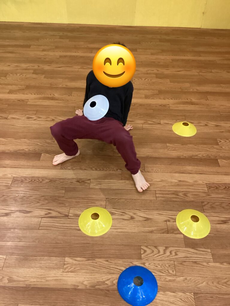決められたマーカーを拾い、集めたマーカーを体に乗せながら進むという、バランス力と集中力が試される運動です。