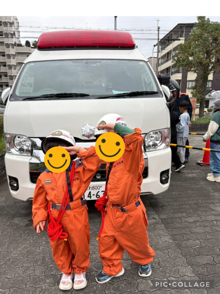 外ではパトカーや消防車が展示され、制服を着て車に乗る事ができ、ポーズをとって写真を撮りました🚓