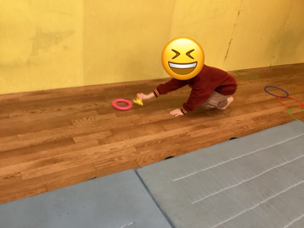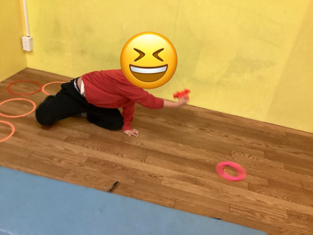 今回行ったフローリングホッケーは、軽くて滑りやすいリングを使用し、手に持ったブロックで打ち合うゲームです。