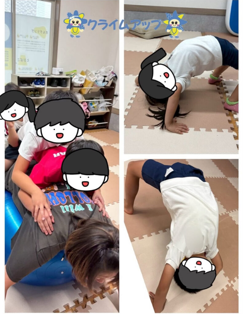 「ブリッジできるで!見てて!」の声とともに、ブリッジ大会がスタート!みんなで見せ合いっこしながら、体幹や腕の力がどんどん強くなっていきます🔥