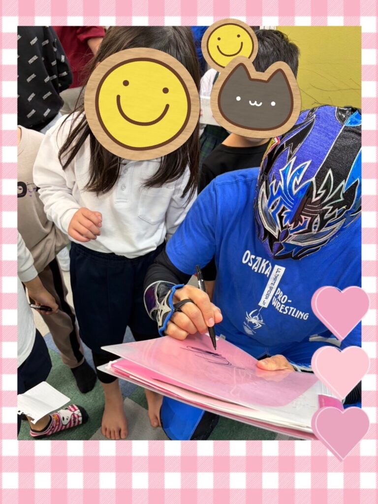 最初は、大きな体のプロレスラーを見て少し緊張気味の子どもたち。