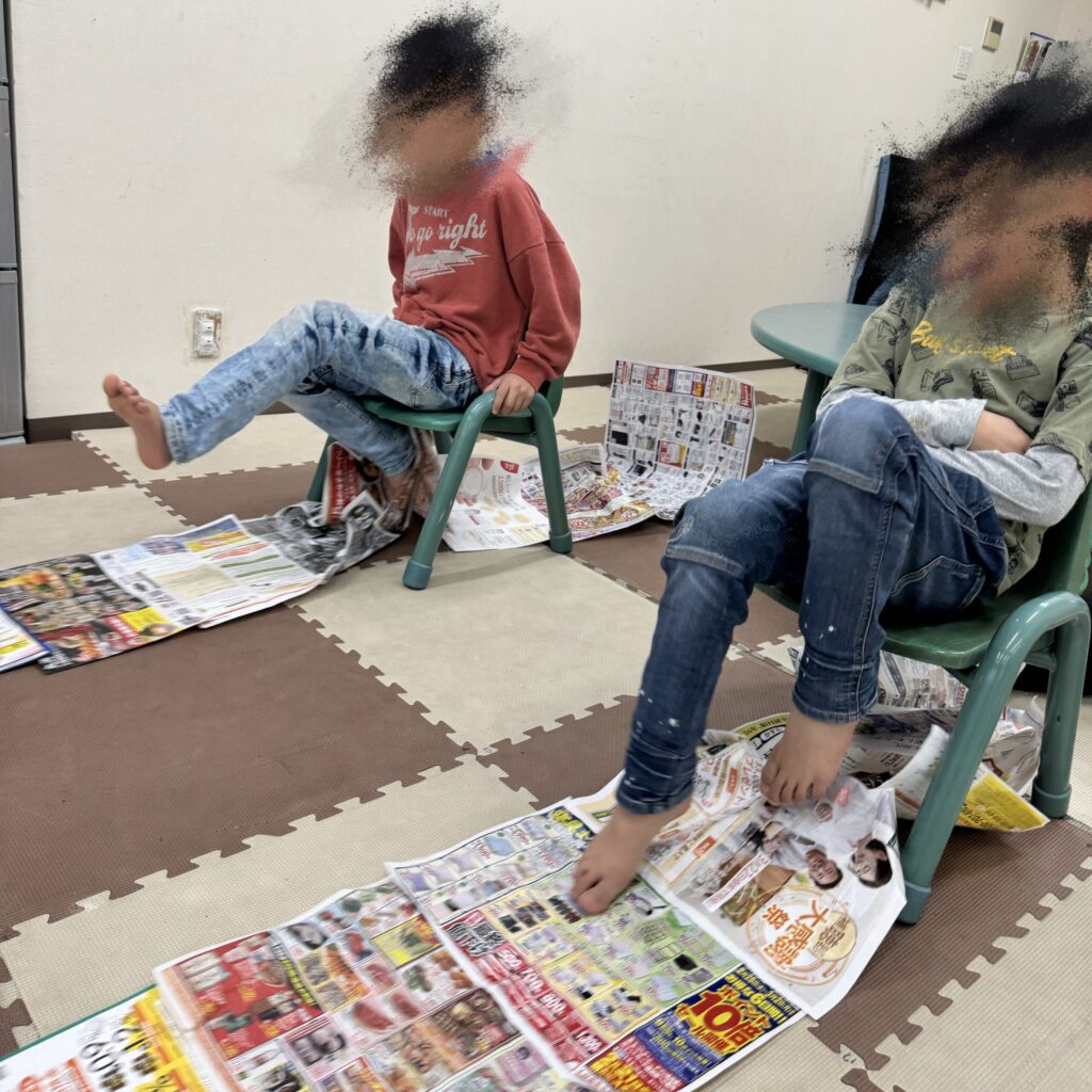 椅子に座った状態で、足だけを使って長くつなげた新聞紙をたぐり寄せていく活動です👣⸒⸒