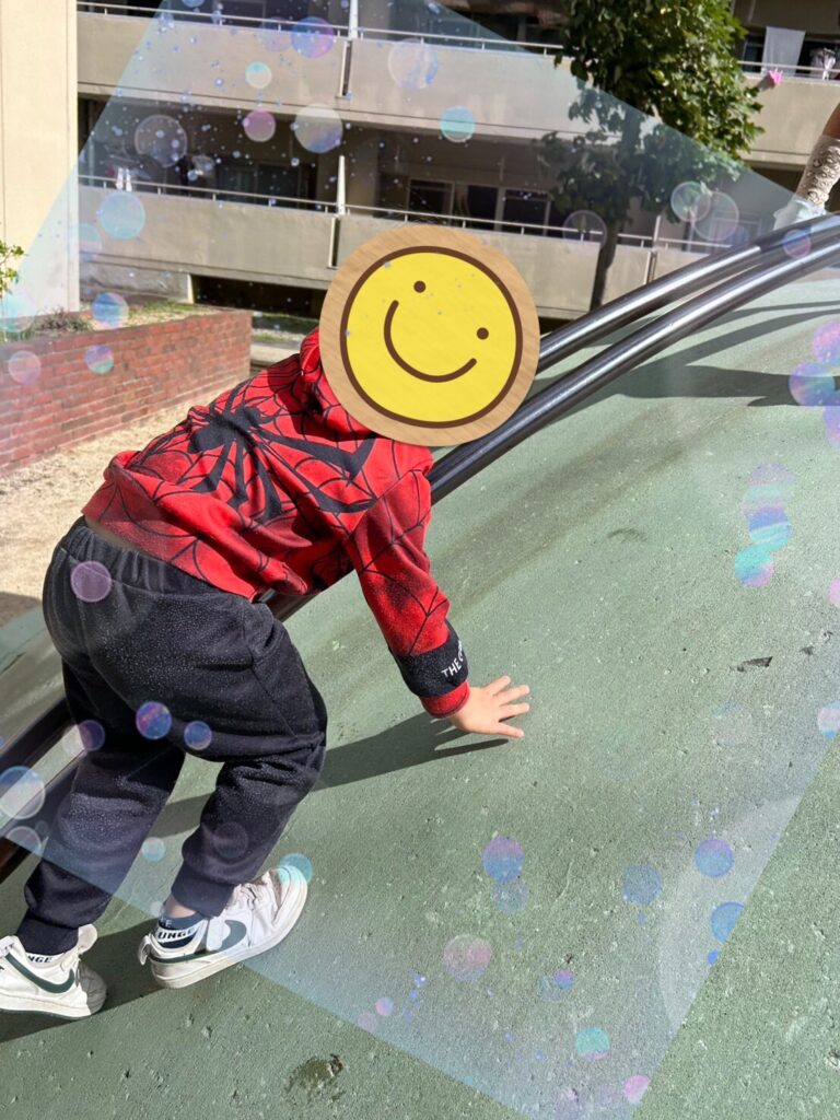 遊具に到着すると、「これ、やっていいの?」「見ててね!」と次々にチャレンジする子どもたち。最初はトンネル型の穴を怖がっていたお子さまも、「〇〇ちゃんができたから、ぼくも…」とゆっくりと進み始め、くぐり抜けた後には満面の笑顔。滑り台では順番を守りながら一人ずつ滑り、「次どうぞ〜」とお友だちを気遣う姿も見られました。