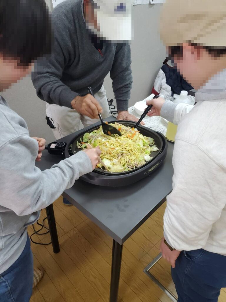 今回のメニューは焼きそば!具材の準備や調理の仕方、職員のサポートを受けながら一つひとつ丁寧に取り組みました。
