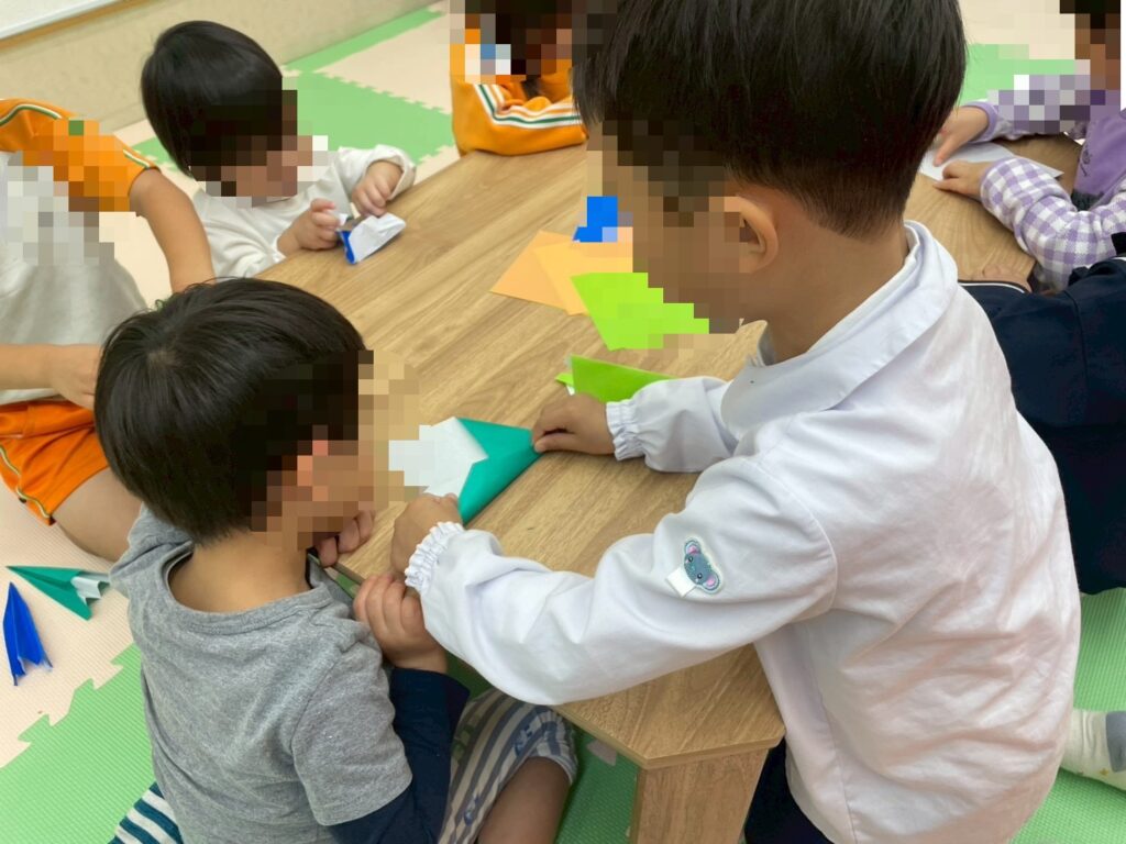 「ここをこう折るとよく飛ぶよ!」とお友だち同士で作り方を教え合ったり、できあがった紙飛行機を外に向かって思いきり飛ばして、飛距離を競いながら大盛り上がりでした😊