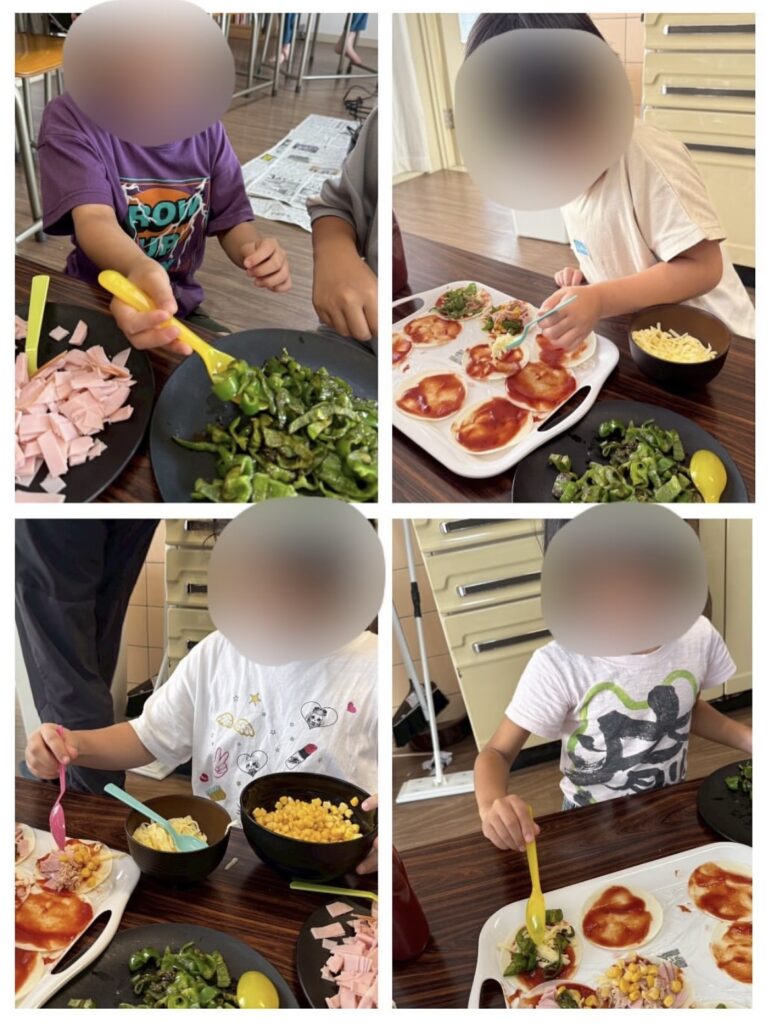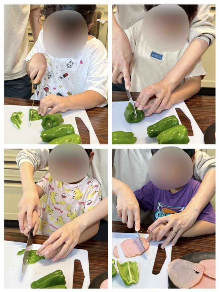 最初は包丁にドキドキだった子も、両手の位置を確認しながら“ネコの手”でトントン。焼き上がったピザをほおばるころには、「ピーマンいけた!」という誇らしい笑顔が広がりました。