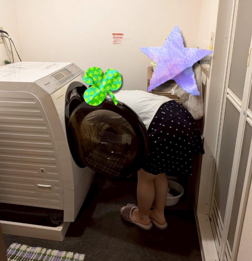 「これ、自分で入れるねん」と、真剣な眼差しで洗濯物を投入。
