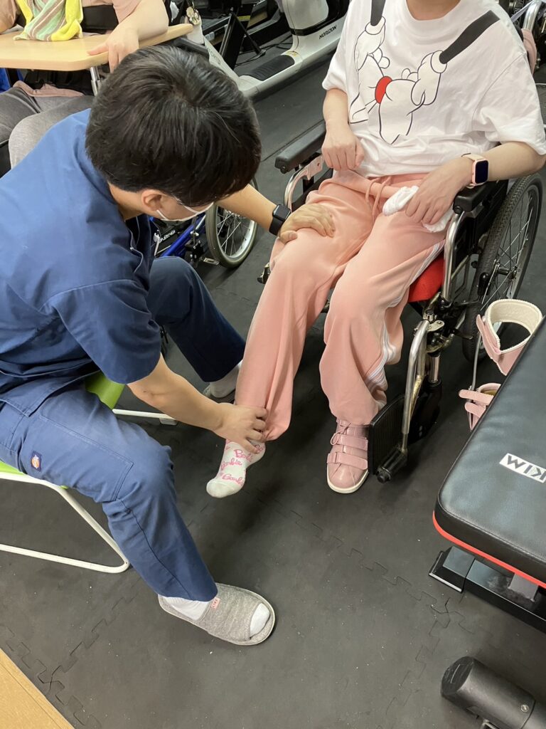 写真は、利用者さまが車椅子に座った状態で足の動きを確認している様子です。