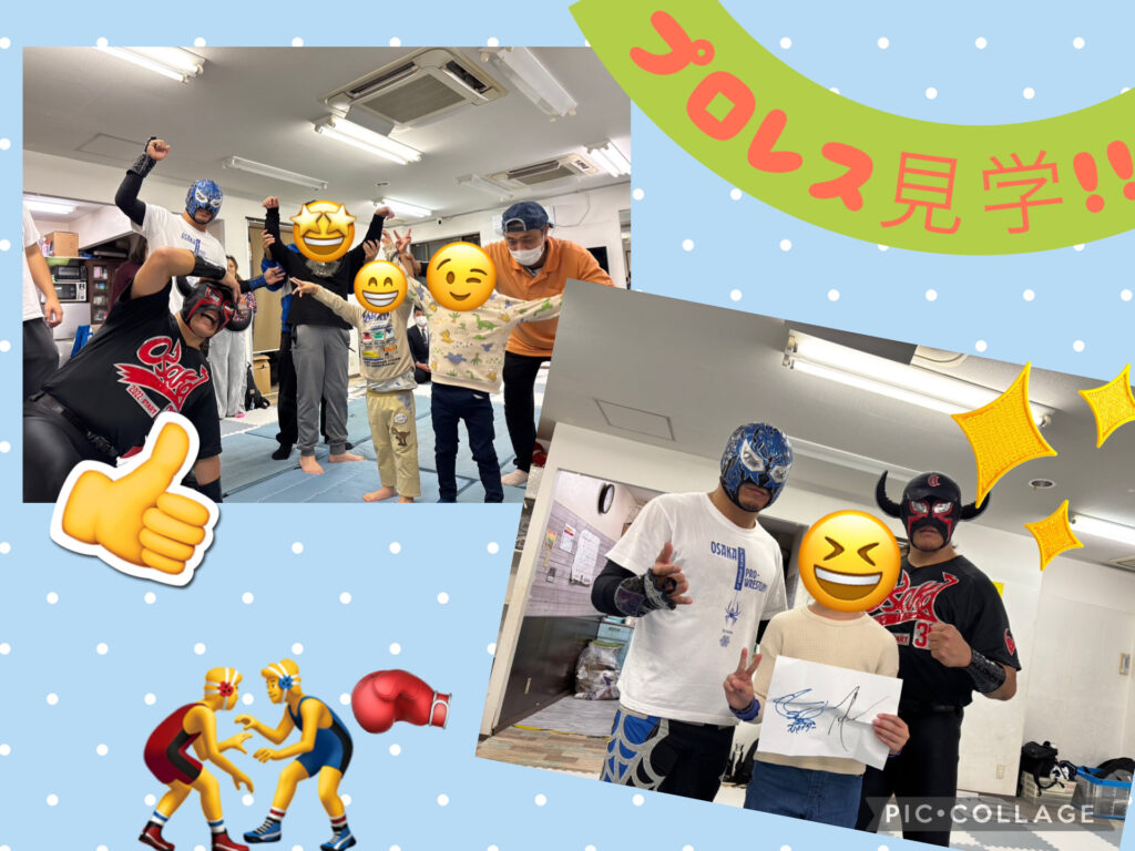 先日、運動療育型児童デイぽぷらの樹東住吉では、子どもたちにとって忘れられない、特別な一日が訪れました。大阪を拠点に活躍する「大阪プロレス」から、現役レスラーのブラックバッファローさんアルティメットスパイダーJrさんという、プロの選手2名をお迎えし、プロレスの技術や身体の動かし方を楽しく学べる体験型イベントを開催しました。